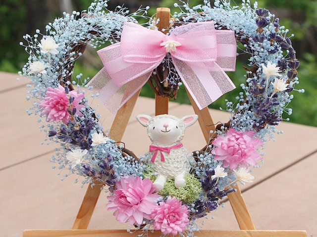 ドライフラワーやリボン、可愛い小鳥を使ってのリース作りです。 お選び頂いた台に用意されているグル―で接着します。